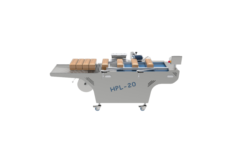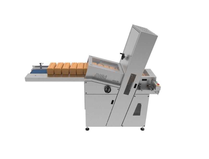 Poluautomatska rezalica za hleb iz kalupa i vekne hleba sa kontinuiranim trakastim noževima.